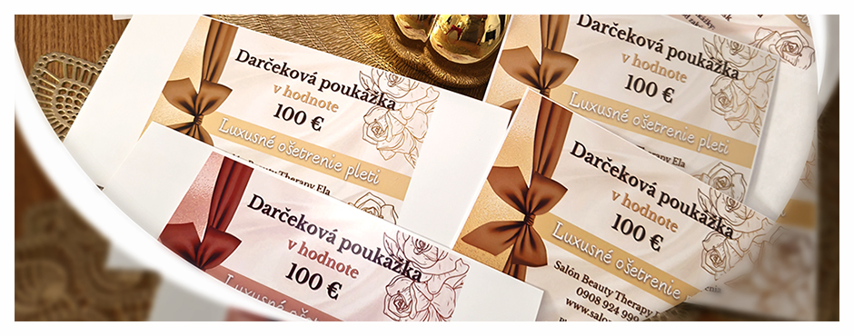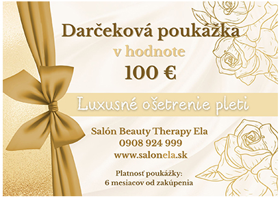 Hľadáte výnimočný darček pre partnerku alebo pre svojho blízkeho človeka? Siahnite po darčekovej poukážke na luxusné ošetrenie pleti. Doprajte Vašej spriaznenej duši chvíle úplného oddychu, žičlivej starostlivosti a dotyk omladzujúcej sviežosti, teda to, čo si nielen zaslúži ale aj ocení. Urobte svojej blízkej osobe radosť a sprostredkujte jej nezabudnuteľný pôžitok zo služby, ktorú poskytuje Salón